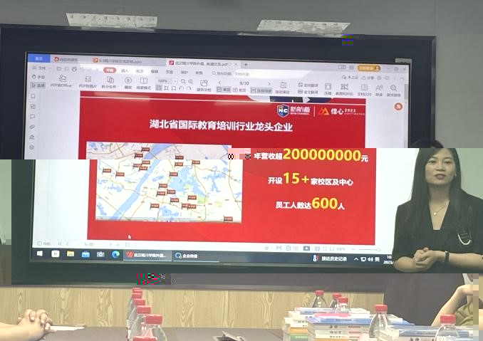 “新航道”招聘與培訓部高級主任張留情向到訪人員詳細介紹了新航道國際教育集團的基本情況以及發展沿革,并重點介紹了集團此次打造的“強基計劃”詳情。她講到現在就業市場競争激烈的情況下,新航道非常重視人才招聘,公司給與應屆本科生的待遇仍然高于平均水準,公司在武漢地區擁有十五個以上校區,員工人數超過六百,未來對人才的需求會不斷擴大。在人員的發展上,公司也有明确的晉升渠道,并有課程顧問、學術助教、市場專員等不同職業路線可根據自身情況進行選擇。她希望未來能和3044am永利集团3044noc達成長期校企合作,共同推進學生實習、就業、學科競賽及人才培養。